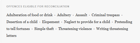 Notice the common thread: these are all personal offences disputes between people who know each other, often arising within families, neighbourhoods, or communities. The law deliberately limits reconciliation to these relational disputes, where restoring the relationship is both feasible and meaningful. Aggravated offences are expressly excluded.