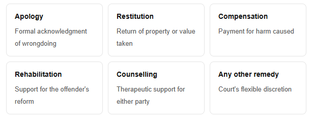 A criminal court operating in the conventional way cannot order any of these except compensation in narrow circumstances. It can convict and sentence; it cannot heal. Reconciliation can. A genuine apology, research consistently shows, is often more valuable to a victim than a fine or imprisonment. Counselling addresses the conditions that gave rise to the dispute. Rehabilitation looks forward, not backward.